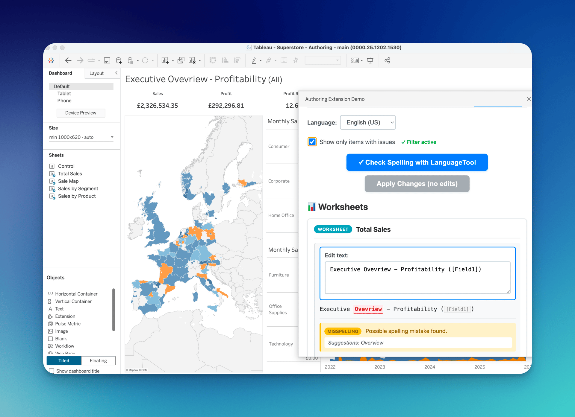 Yes, a working spellchecker in Tableau Desktop that scans all text and lets you fix issues inline.
