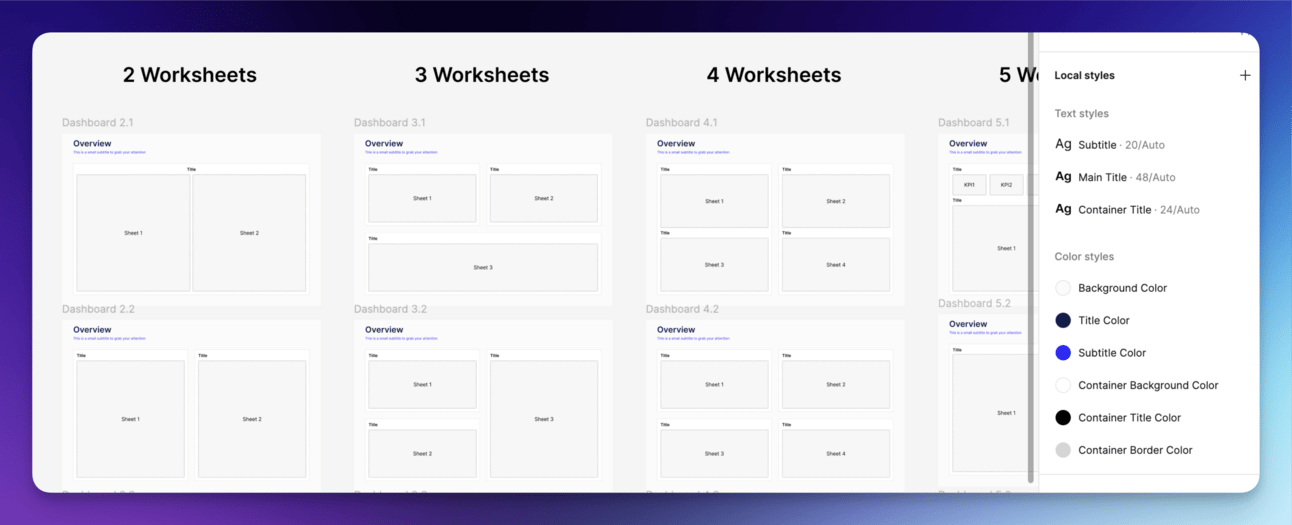 We tried our iteration of templates using Figma. We wanted dashboards ready to be exported to Tableau, with the main advantage being that you can easily modify some styles.