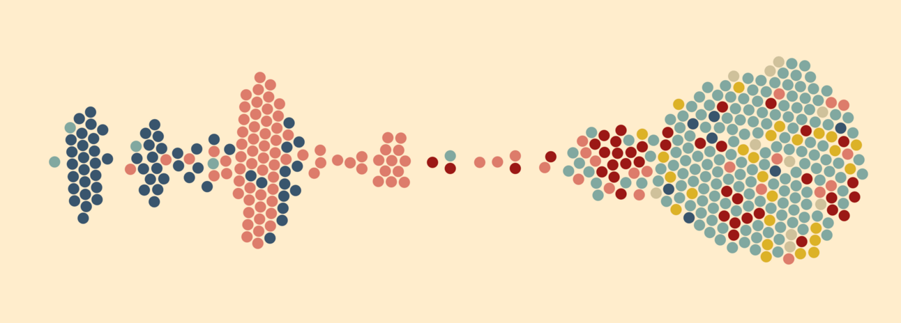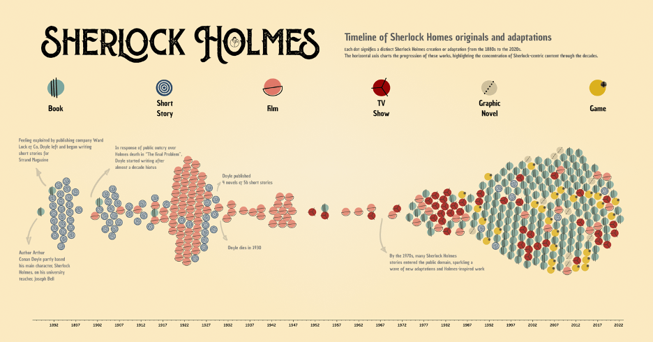 Quickly, we had the idea to visualize all Sherlock canons and adaptations using a Beeswarm. We wanted the background to be yellowish to remind us of old books, and we used colors to differentiate the different types of adaptations (books, TV shows, movies, etc).