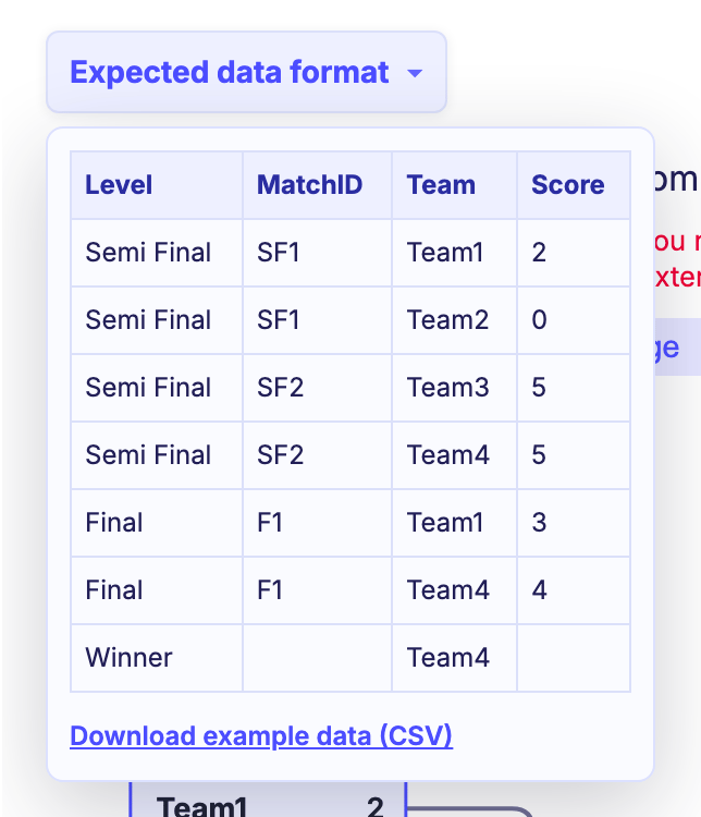 This is the first extension that requires your data in a specific format. Unlike our other extensions, a tournament bracket needs to understand the structure of your tournament: which teams played in which match, in which round, and who ultimately won.