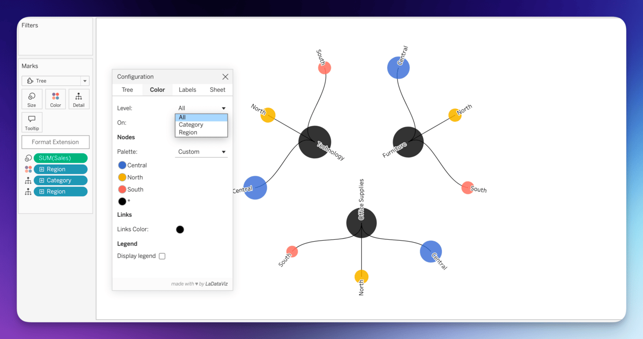 This was challenging because the Tree shows information at different aggregation levels. To be consistent with Tableau’s behavior when that happens, we added “*” to indicate if a node has multiple different color values.