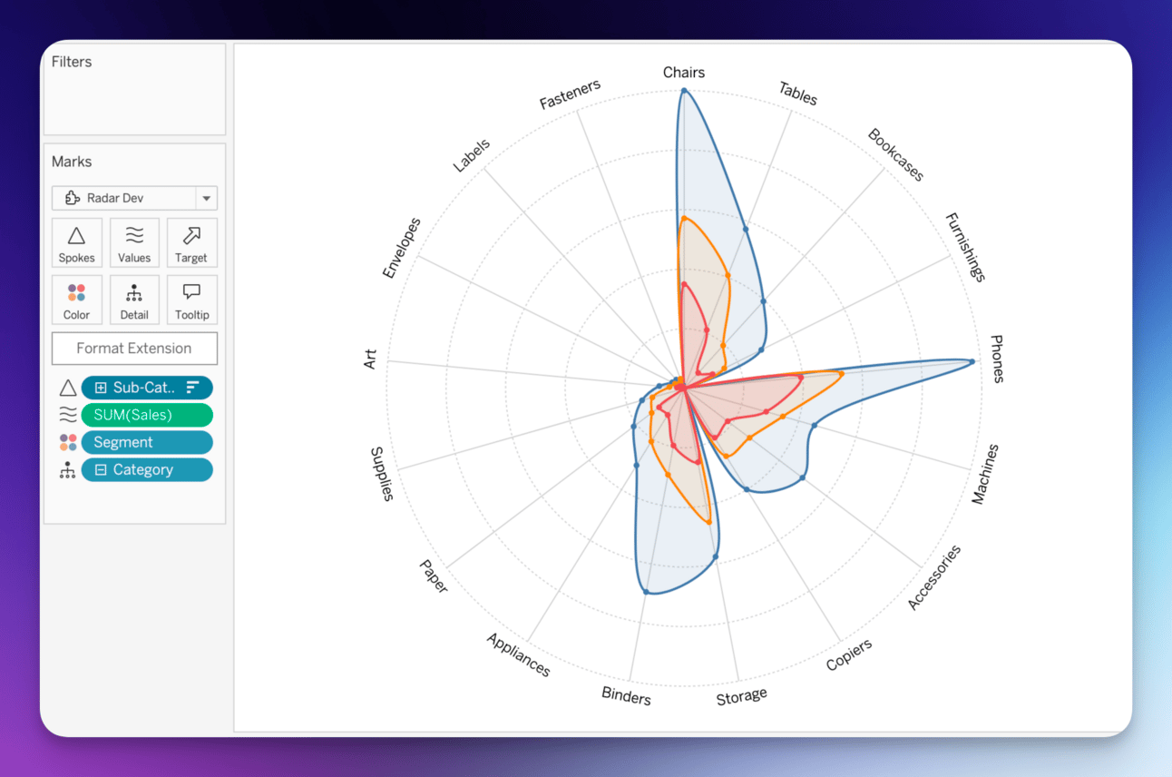 Since we added a new Mark, you must use the latest file radar_v2.trex, which is available on our website. Tableau Exchange has not yet been updated.