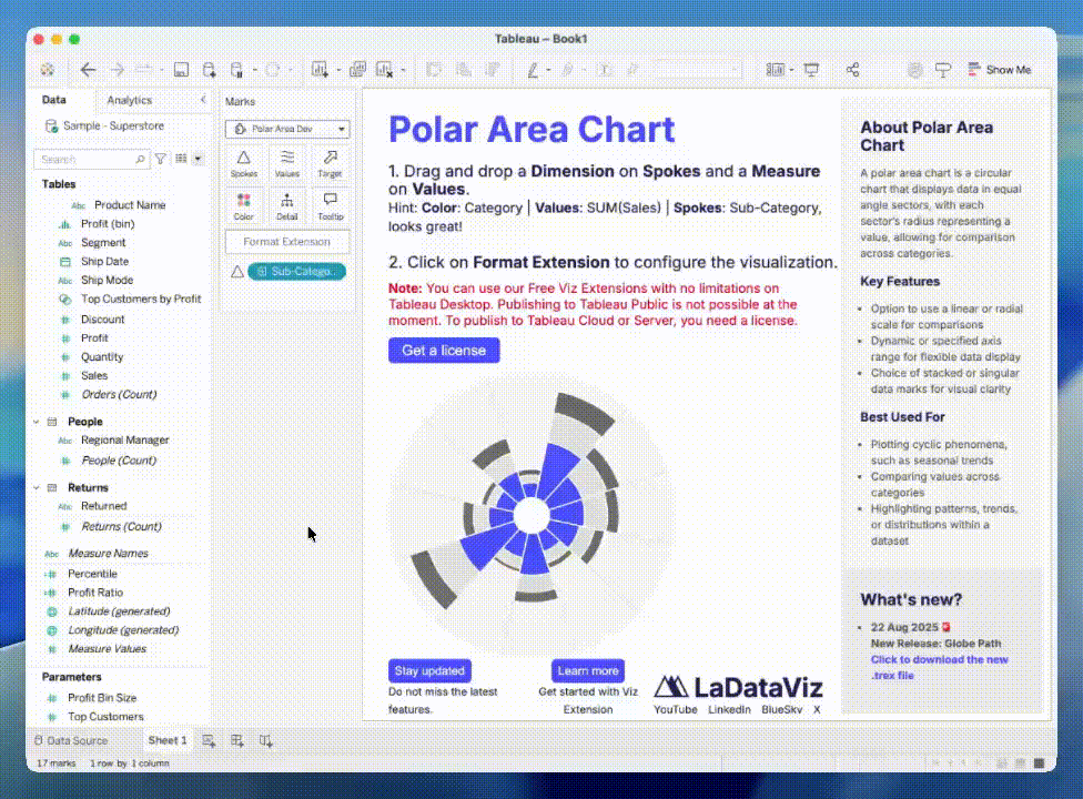 Polar/Radar - We added the option to display a label that is different than the value in the chart. That feature was requested a few times, especially for sports analytics. You can now show the percentile as the value, and the actual amount in the labels. To do that, drag and drop a second field in Values and use the option in the Format window.