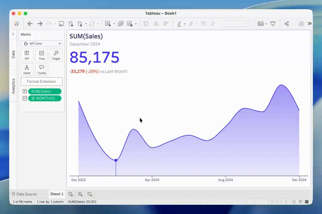 KPI - Our KPI Card extension got a big update! You can click on the evolution chart to filter the rest of your dashboard! You can also now hide the KPI itself if you want to show the evolution with nicer chart types than Tableau allows.