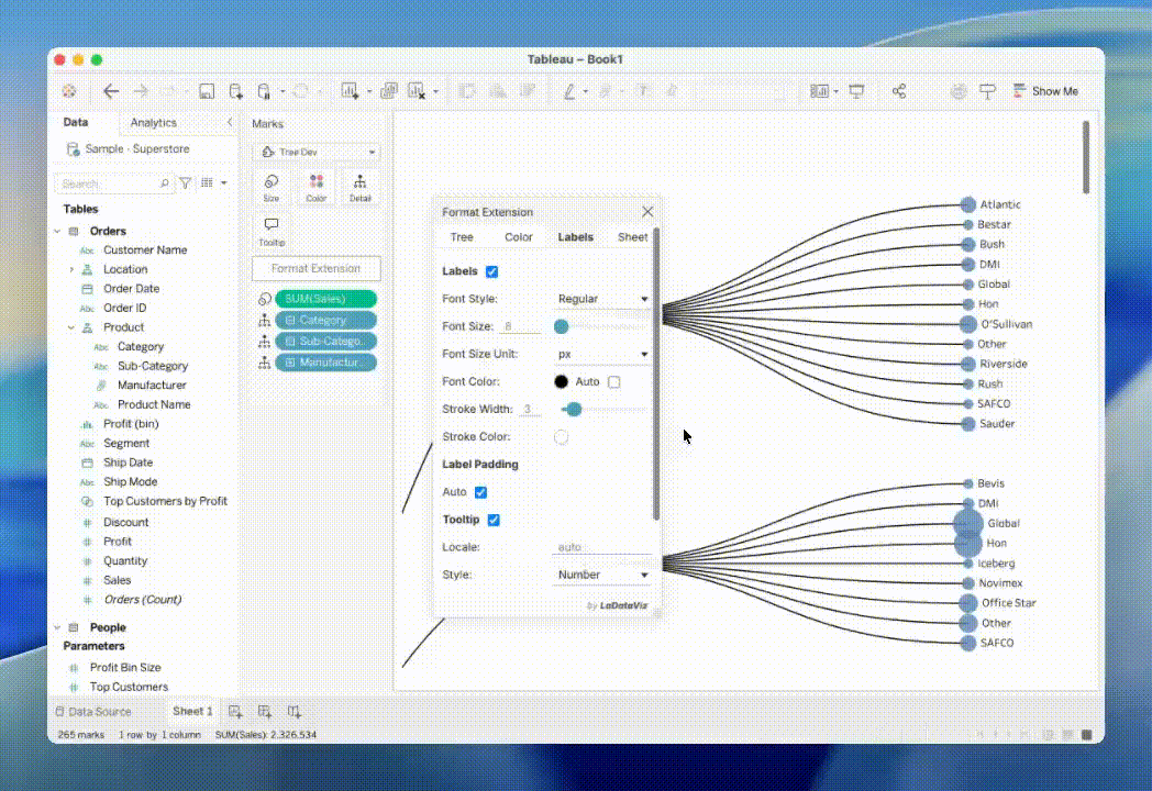 Tree - The second update is about the Tree Diagram. We improved the labels' padding to be automatic depending on the size of the circles, with the option to change to manual and specify it precisely. You can also zoom and pan in the tree just as in the network, holding CTRL/CMD.